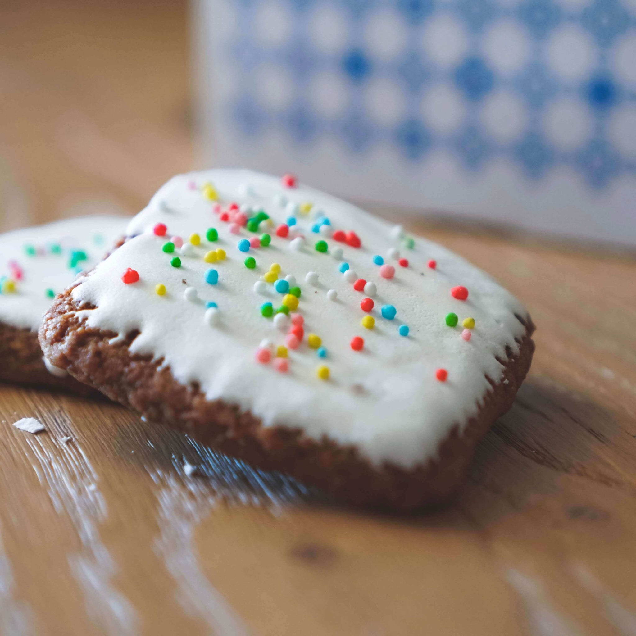 Papassinos con la glassa: farina 00, zucchero, mandorle, uova, strutto, uvetta, aromi naturali, anice stellato, carbonato d'ammonio --